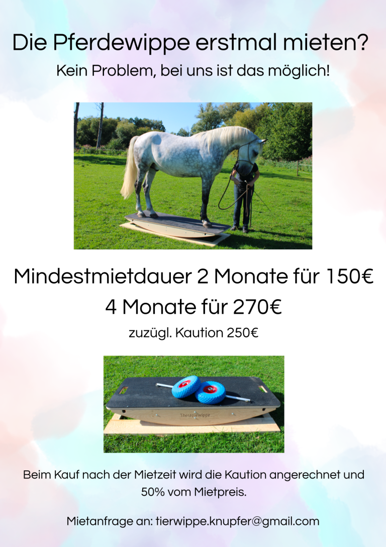 Beginne zwingend erst mit einer gepolsterten Pferdewippe. Wenn die Wippe zu beginn zu stark wippt kann das Pferd überanstrengt werden und somit Muskelkater bekommen. Hier findest du das passende Video dazu.